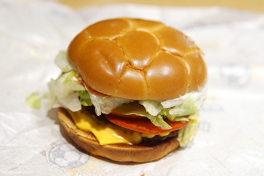 페퍼로니 피자버거에서 가장 맘에 드는 건 싸커번.. 축구공모양 크라운이 너무 귀여워요.. 표면이 맨질맨질한게 광택이 나서 더 귀여운 느낌이랄까..