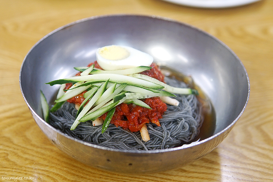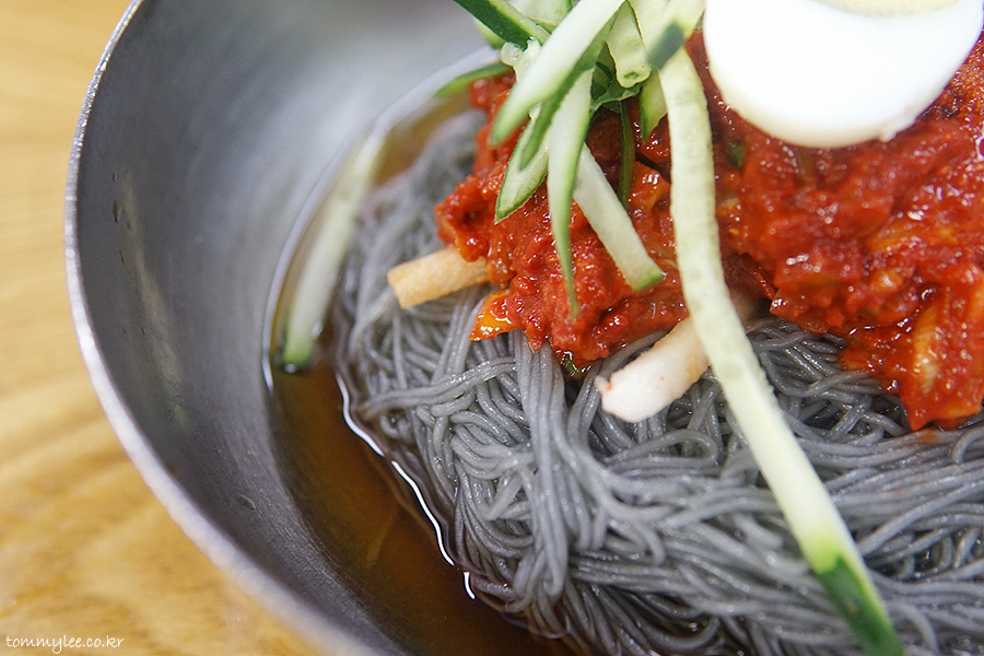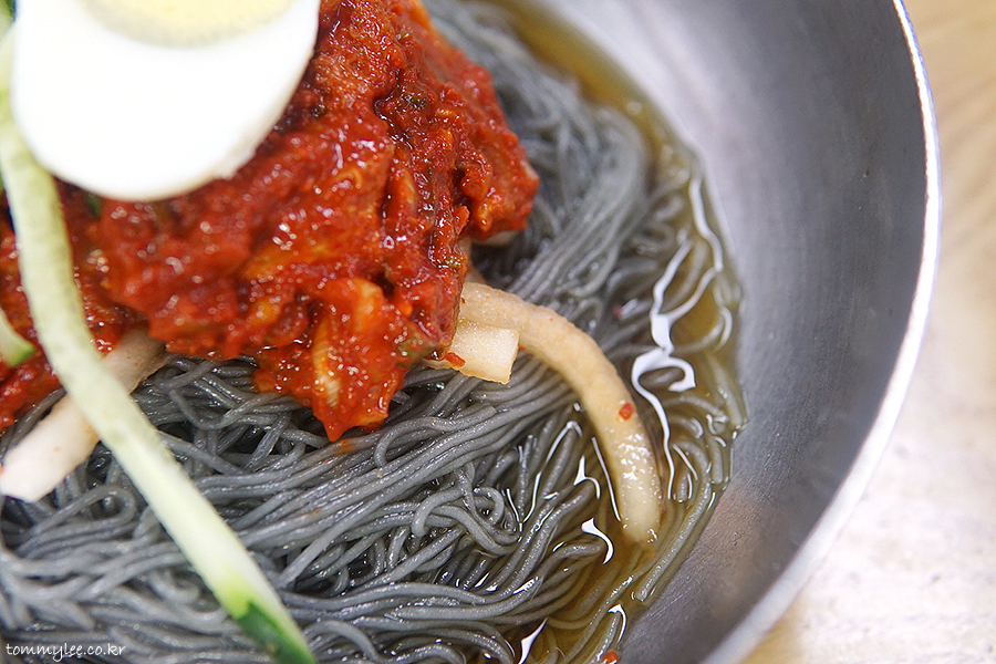 회냉면과는 달리 비빔양념을 면에 끼얹은 상태로 나오는 고기냉면의 모습입니다.. 회무침을 토핑 해서 나오는 회냉면이랑 이 점이 달라요..
