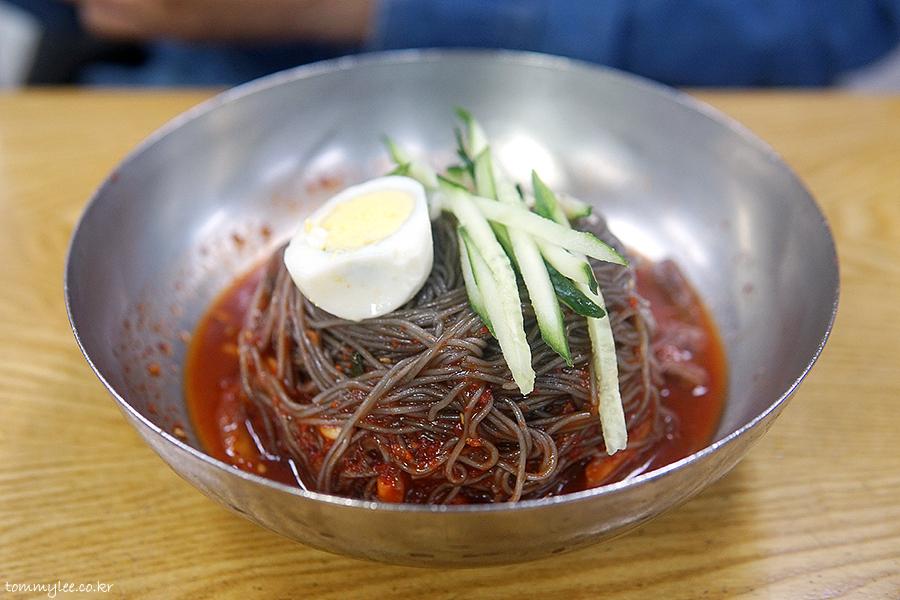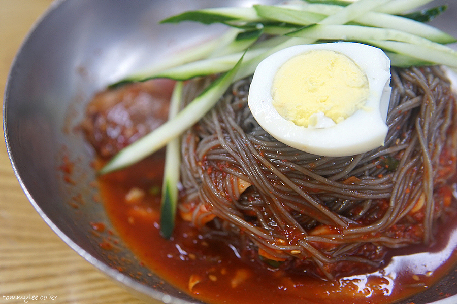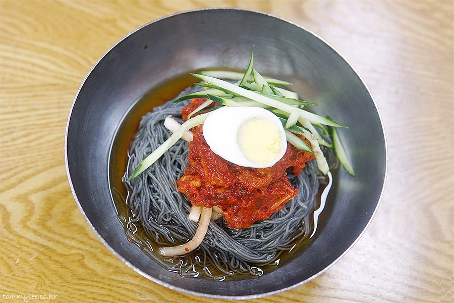 맛집답게 정말 단시간에 제공된 냉면.. 너무 빨리 나와서 웃겼어요.. ㅋㅋㅋ.. 보통은 고기 고명이 돋보이게 냉면 위에 올리지만 흥남집 고기냉면 고명은 오이채와 삶은 달걀뿐이고 고기는 면 아래에 깔려 나옵니다.. 이게 좀 특이하죠..