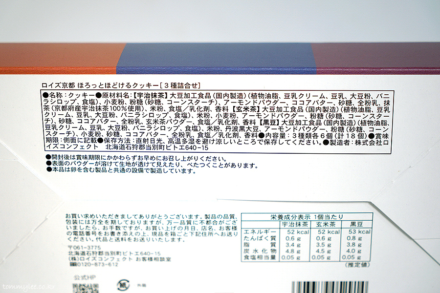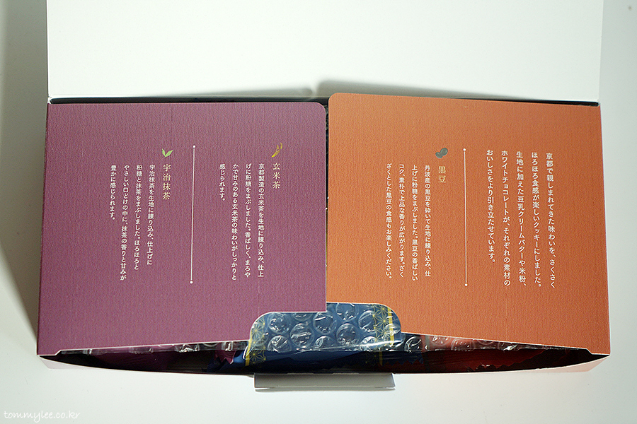 교토의 친숙한 맛을 식감이 즐거운 쿠키로 만들었고, 반죽에 더한 두유크림버터와 쌀가루, 화이트초콜릿이 소재의 맛을 더 돋보이게 해준다고 쓰여있음..