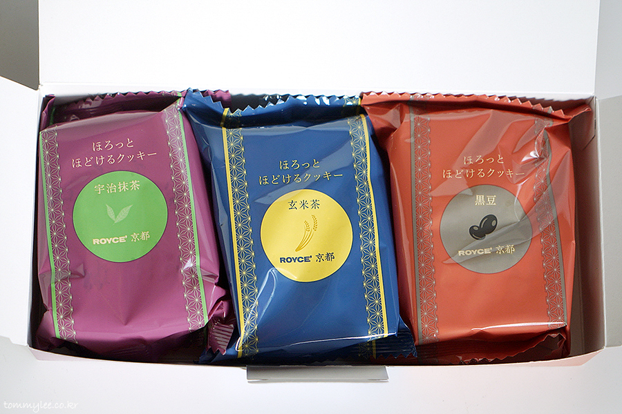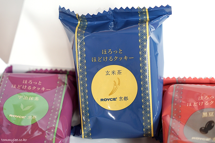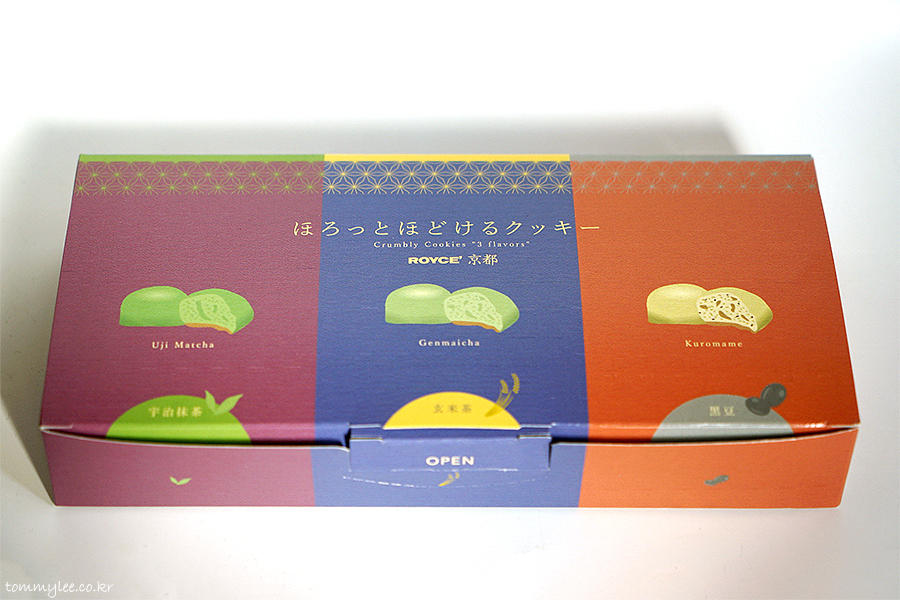 ROYCE' KYOTO.. CRUMBLY COOKIES 3 FLAVORS.. UJI MATCHA, GENMAICHA, KUROMAME.. 텍스처가 있는 패키지 고급지네요..