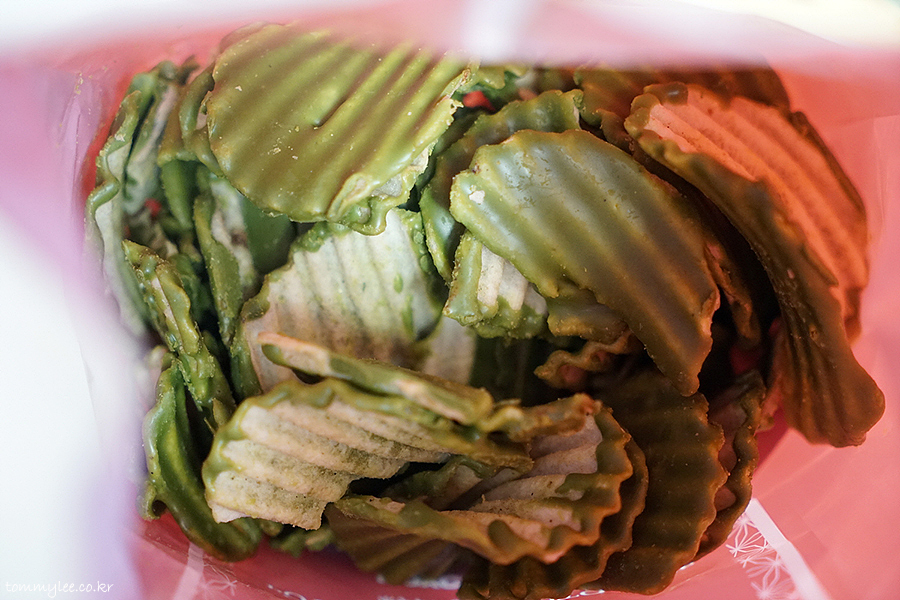 오픈해 보면 이런 느낌.. 말차초콜릿이 발린 감자칩이 한가득 들어 있습니다.. 중량 190g으로 양이 상당히 많은 편입니다..