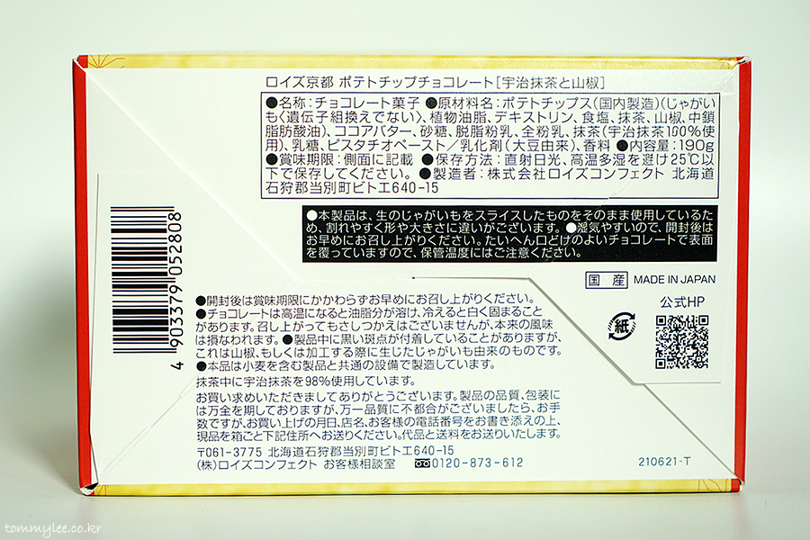 원재료 : 감자칩 (국내제조) (감자 (유전자변형아님), 식물성유지, 덱스트린, 식염, 말차, 산자, 중사슬지방산유), 코코아버터, 설탕, 탈지분유, 전지분유, 말차 (우치말차100%사용), 유당, 피스타치오페이스트/유화제(대두유래), 향료.. MADE IN JAPAN..