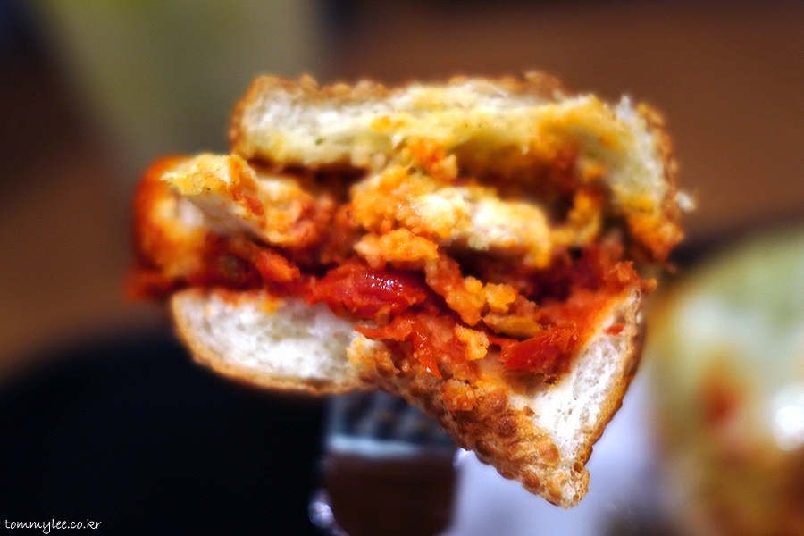 토마토 소스가 생각보다 좀 본격적인 느낌이랄까.. 토마토 페이스트만 들어간 게 아니고 토마토 질감을 느낄 수 있는 크러쉬드 토마토에 토마토 다이스까지 사용했습니다.. 그래서 좀 기존 샌드위치보단 고급스러운 느낌이에요..