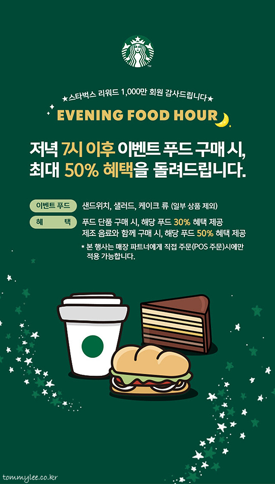스타벅스 리워드 천만 회원 감사 이벤트로 저녁 7시 이후 푸드 메뉴 구매 시 푸드 50% 할인을 하는 이브닝 페어링이 한시적으로 부활했습니다.. 그래서 최근에 저녁시간에 스타벅스 가는 즐거움이 있어요..