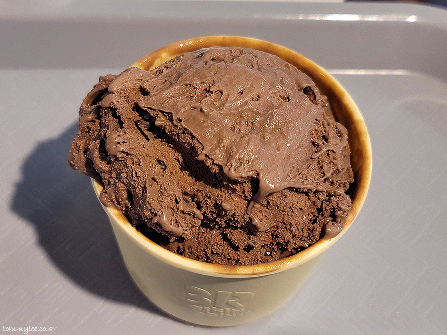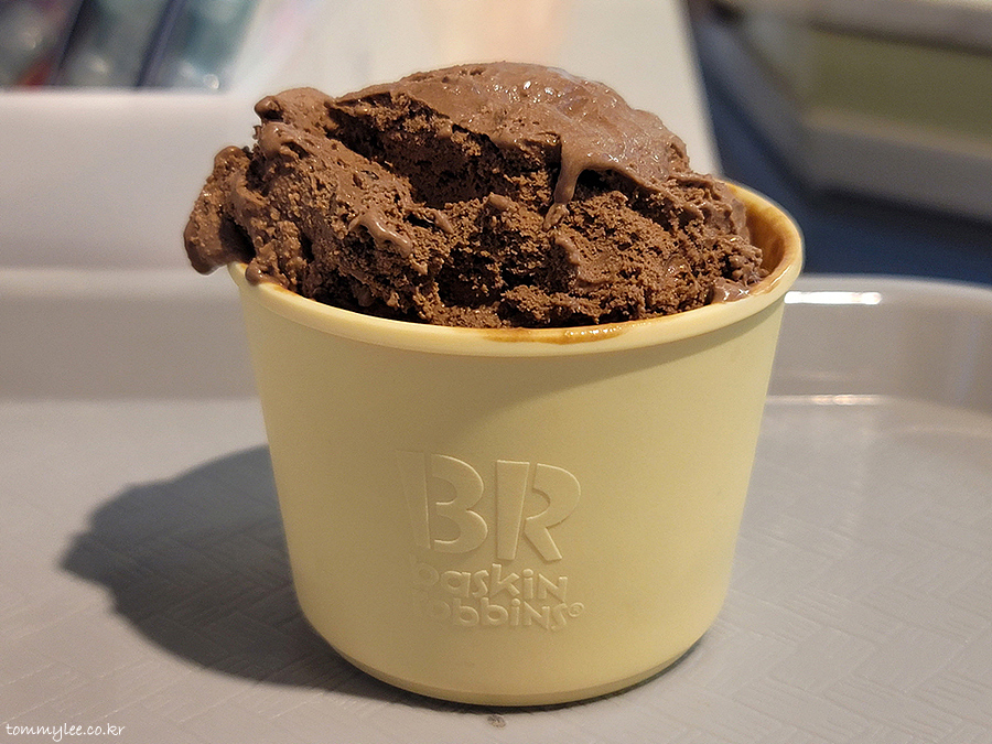 배스킨라빈스에는 초콜릿 아이스크림이 2가지 고정이라 보시면 되는데요.. 초콜릿 아이스크림과 초콜릿무스라는 아이스크림이 2가지 있습니다.. 기본인 초콜릿 맛이 초콜릿 풍미가 더 진하고 한데요..