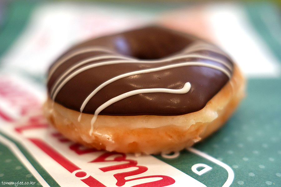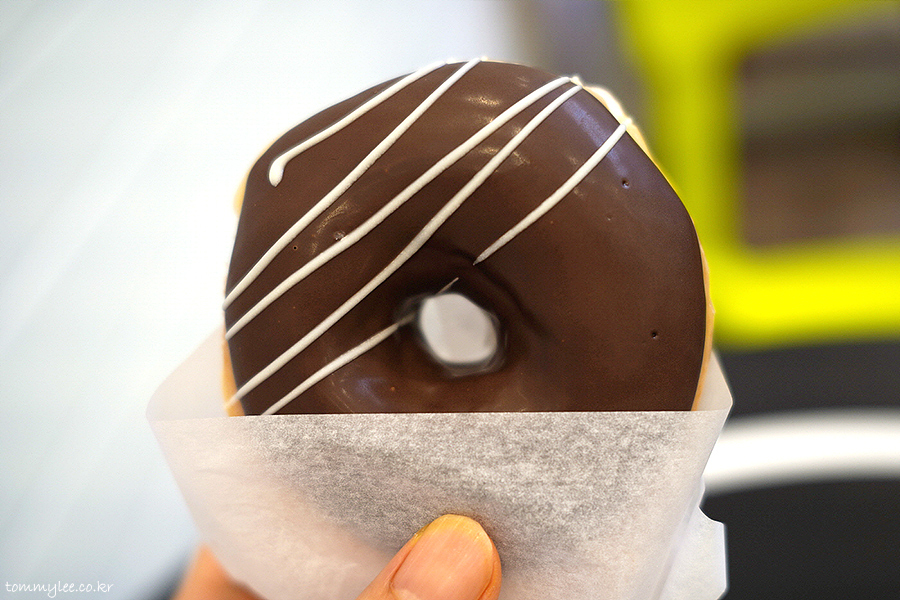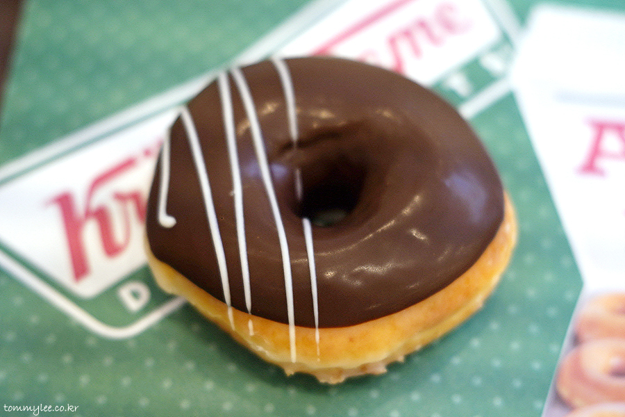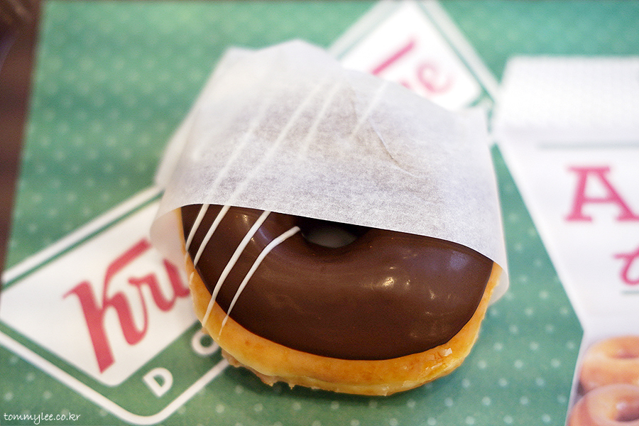 오리지널 글레이즈드와 200원 차이인데 초콜릿이 이렇게 두툼하게 코팅이 되어 있으면 초콜릿 아이스드 글레이즈드가 더 유리한 게 아닌가 싶기도 하고..