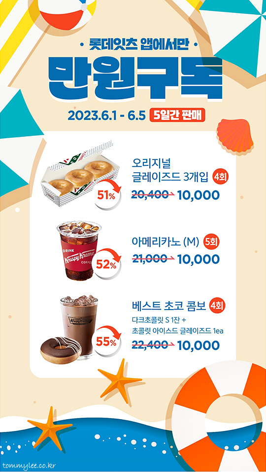 매달 1일~5일에 롯데잇츠 앱에서 크리스피크림 만원구독 쿠폰행사를 하는데요.. 이걸 구입해 두시면 크리스피크림을 매우 저렴하게 이용할 수 있답니다.. 6월에는 오리지널 글레이즈드 3개입과 베스트 초코콤보 구독권을 구입했네요.. 아메리카노는 평소에 쿠폰이 자주 나와서 저는 안 삼.. ㅋㅋㅋ..