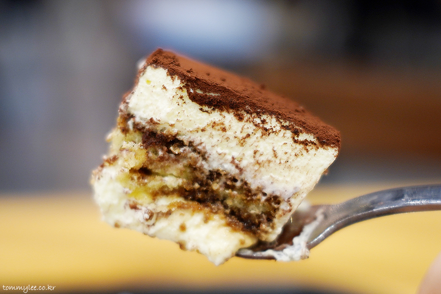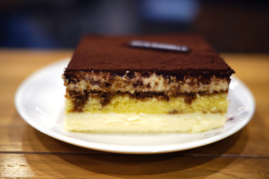 에스프레소를 머금은 케이크시트에 마스카포네 크림치즈, 발로나 코코아 파우더의 조합..