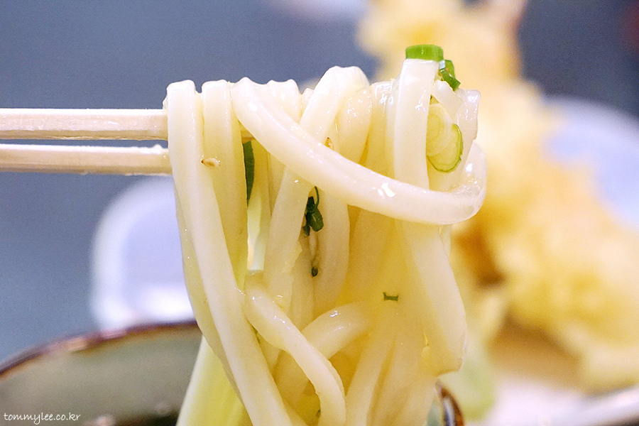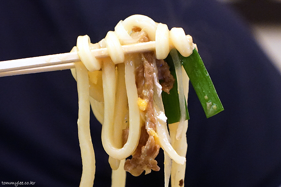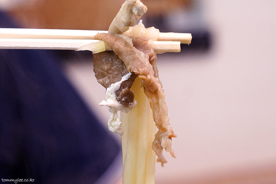 우동면을 들어 올리면 이런 느낌.. 면이 굵어서 많이 무겁네요.. 이 중량감 넘 사랑스럽다며 막.. ㅋㅋㅋ..