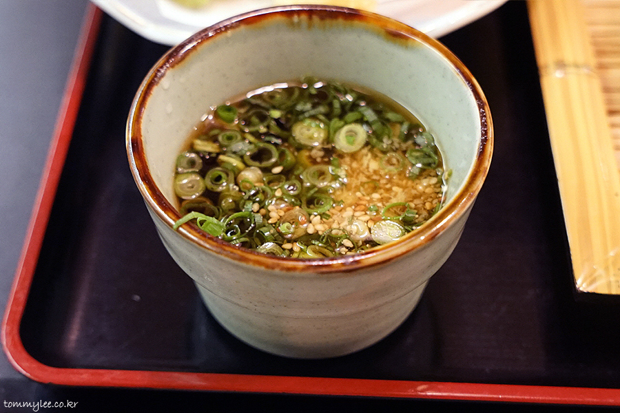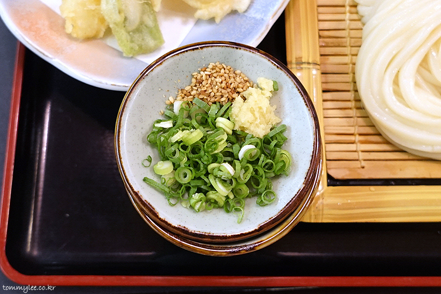 우동쯔유 토핑은 파랑 깨, 생강 이렇게였어요.. 쯔유에 투입해서 드시면 되는 거고요..