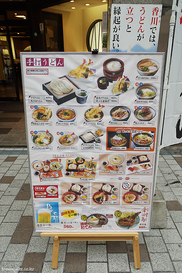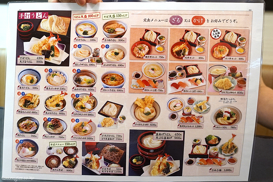 테우치(수타) 우동을 강조하고 있는 수타우동전문점 사누키면업(?)입니다.. 우동 가격은 300엔대부터니까 저렴한 편이고요.. 메뉴 가짓수가 많아서 선택의 폭이 넓고 메뉴판에 이렇게 사진이 다 있어서 주문하기도 편한.. 프랜차이즈이니만큼 영어메뉴도 아마 있을 것 같네요..