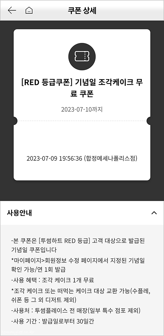 투썸플레이스 기념일 쿠폰으로는 조각 케이크 아무거나 하나 드실 수 있는 내용.. 지정된 기념일 전후 15일간 사용하실 수 있고요..