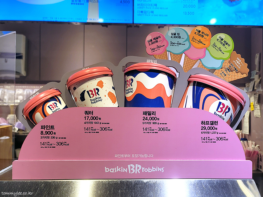 배스킨라빈스31 아이스크림 사이즈 및 가격.. 싱글레귤러 3,500원, 싱글킹 4,300원, 더블주니어 4,700원, 더블레귤러 6,700원 / 파인트 8,900원, 쿼터 17,000원, 패밀리 24,000원, 하프갤런 29,000원..