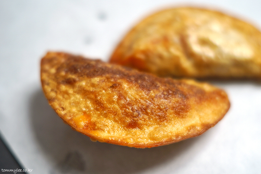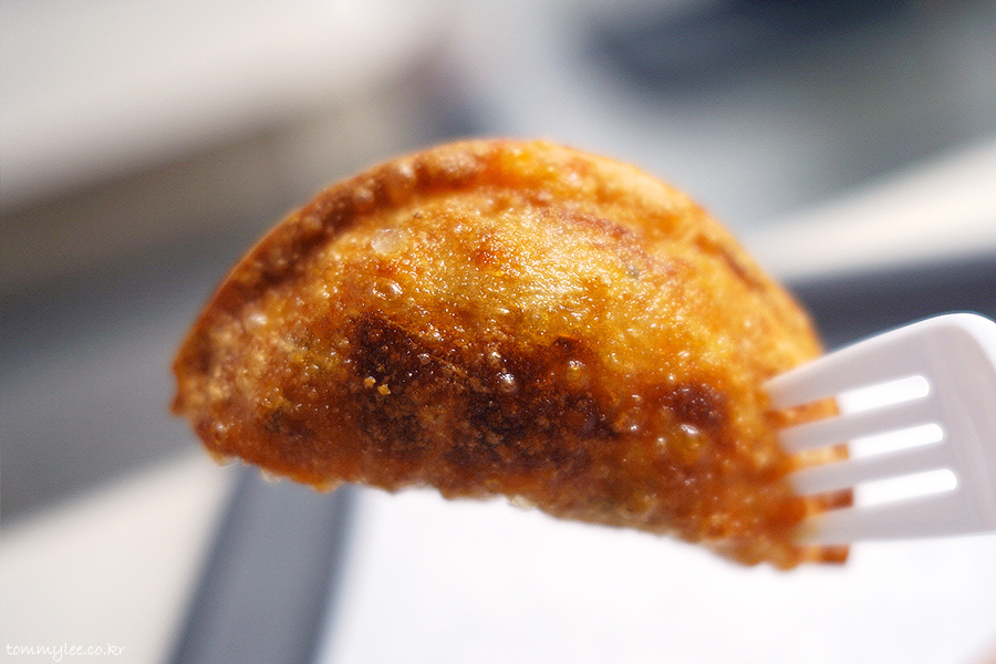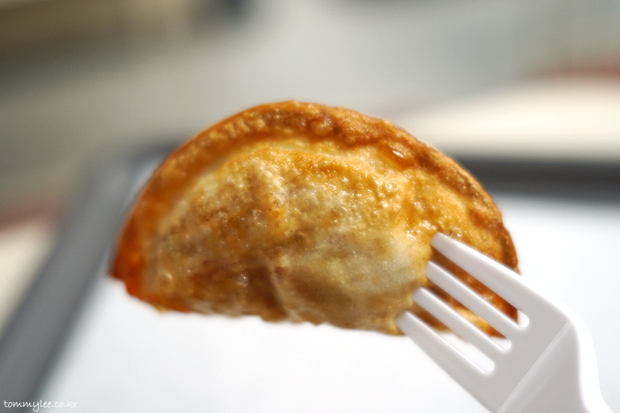 저는 저의 분수를 잘 알기 때문에 일반(?) 매운만두로 주문했습니다.. 보시다시피 반달모양의 군만두입니다.. 겉보기엔 하나도 안매워 보입니다만 이게 맵다는 거..