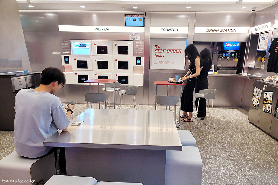 왼쪽이 픽업 박스이고요.. 오른쪽이 드링크스테이션입니다.. 영수증에 있는 바코드를 스캔하면 내 제품이 준비된 픽업박스 번호를 알려 주는데요.. 픽업박스로 가서 똑똑 노크를 하면 픽업박스가 열려 제품을 픽업할 수 있는 방식입니다..