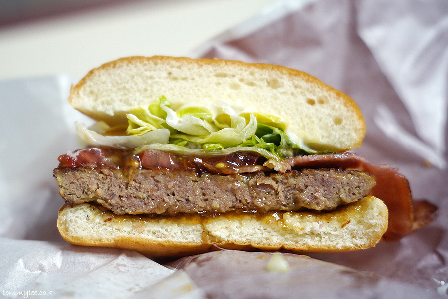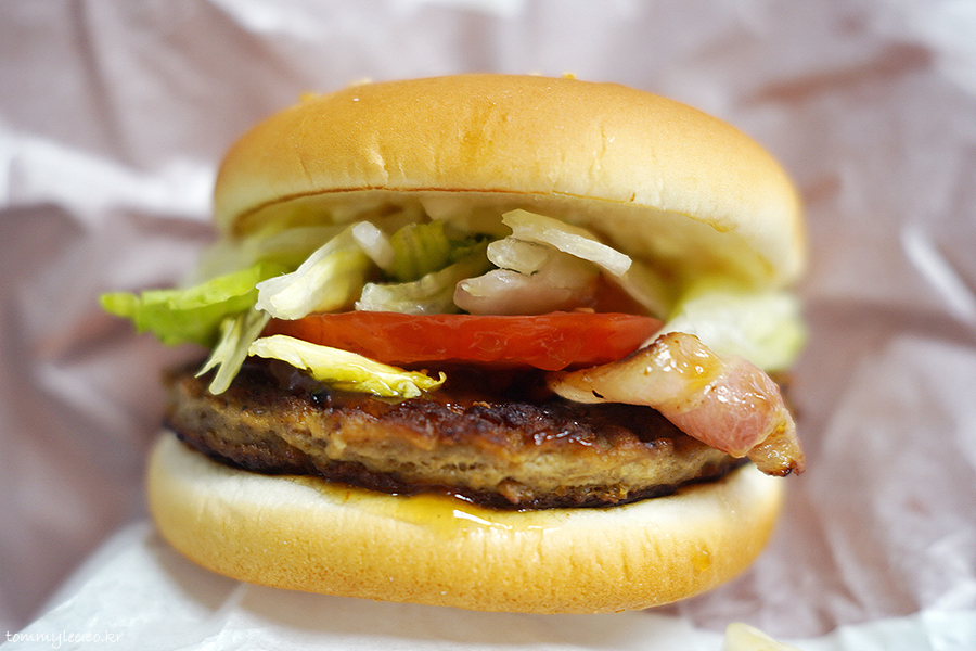 불고기베이컨 버거 구성은.. 쎄서미번-마요네즈-양파-양상추-토마토-베이컨-불고기소스-불고기패티-번의 순서..