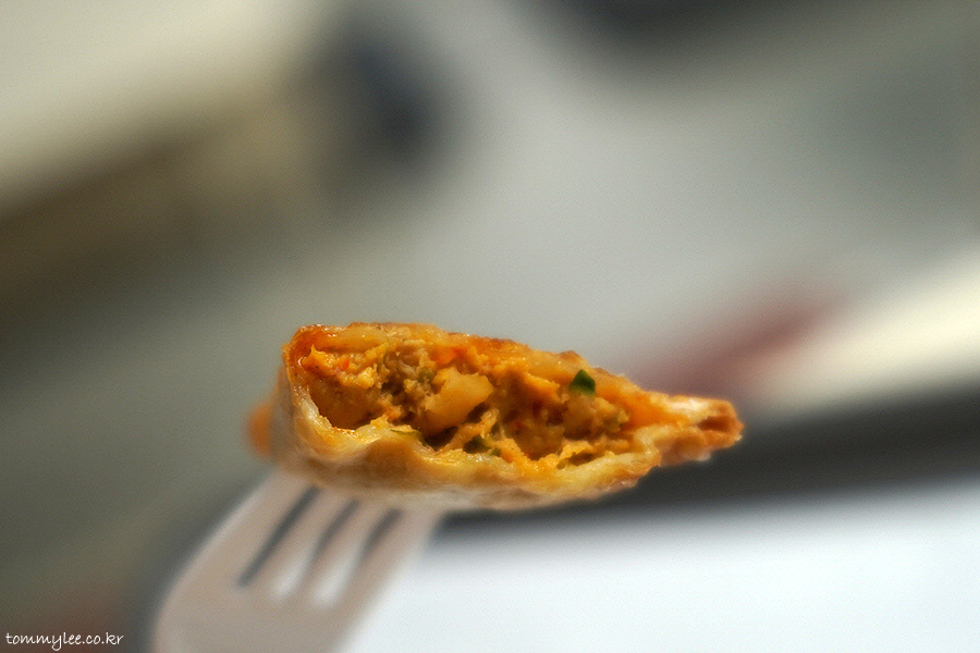 매운만두를 커팅해보면 이런 느낌.. 매운거 못드시는 분들도 충분히 소화해내실 수 있을만한 매운강도입니다.. 별로 안매워서 입이 편안하다며 좋아하고 막.. ㅋㅋㅋ..