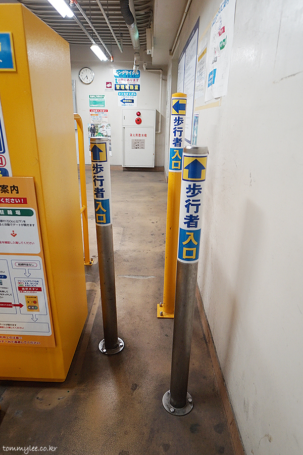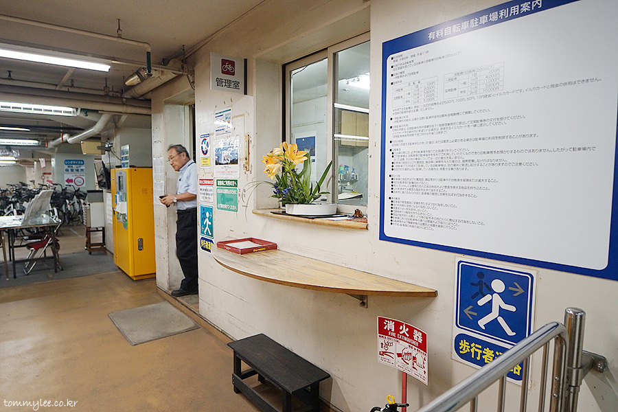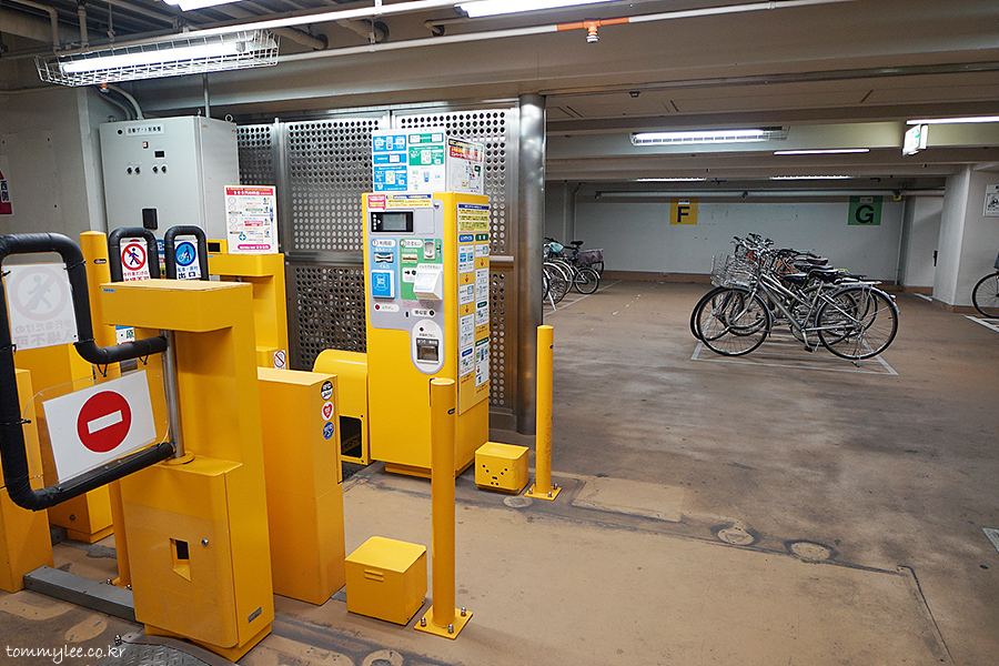 유료 자전거 주차장인말큼 이렇게 주차료를 낼 수 있게 정산기가 달린 입출구가 있는 모습이고요.. 자전거 주차요금은 1회 100엔, 원동기장치자건거(50cc이하니까 스쿠터라고 보시면 되겠죠) 요건 200엔이라고 합니다.. 이용시간은 06:00~23:00..
