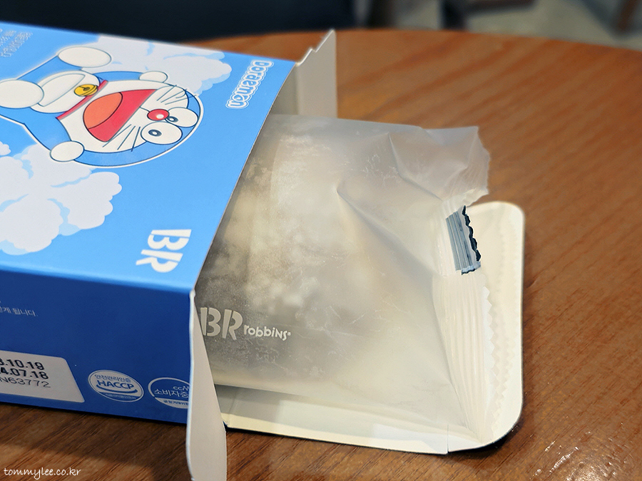 오픈해보면 이런 느낌.. 박스만 도라에몽이고 안쪽 내용물은 늘 먹던 그 아이스찰떡 포장입니다..