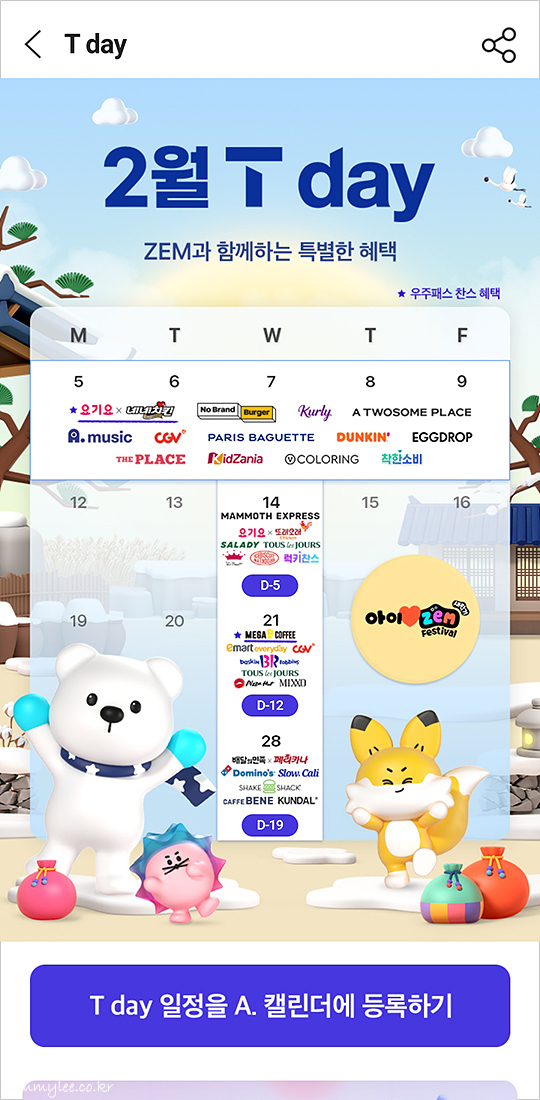 2024년에도 T멤버십 T데이는 계속됩니다.. 2월 T데이 행사 내용 나름 괜찮은 듯.. 파리바게뜨가 T데이스럽지 않은 20%할인인 걸 제외하면 훈훈한 내용입니다..