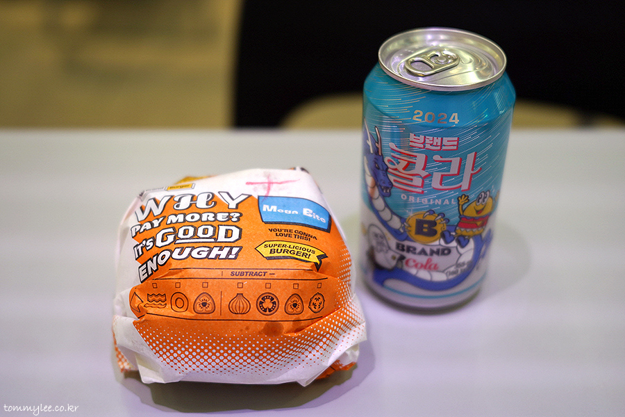 T데이 행사로 받은 메가바이트 콤보입니다.. 노브랜드버거는 포장 주문 시 이렇게 캔으로 된 콜라랑 사이다를 받을 수 있어서 좋다는.. 브랜드콜라 블루드래곤 에디션 굿굿~..