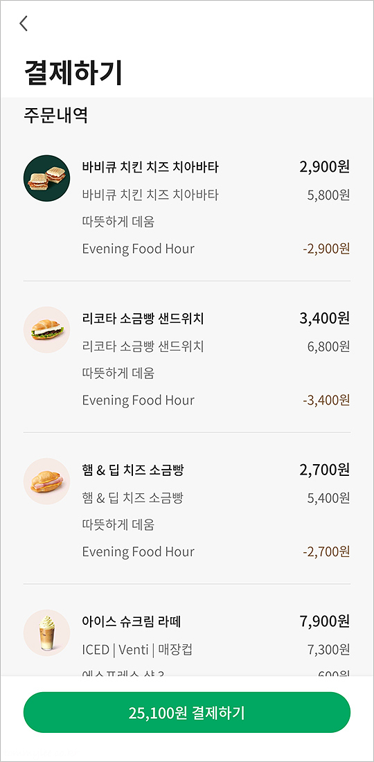 스타벅스 사이렌오더 이용할 때 이브닝 푸드아워 할인 시간대엔 이렇게 팝업이 뜨면서 할인안내를 해줬는데요.. 이것도 오늘이 마지막이네요.. 사이렌오더로도 할인받을 수 있어서 편했는데.. ㅠ.ㅠ..