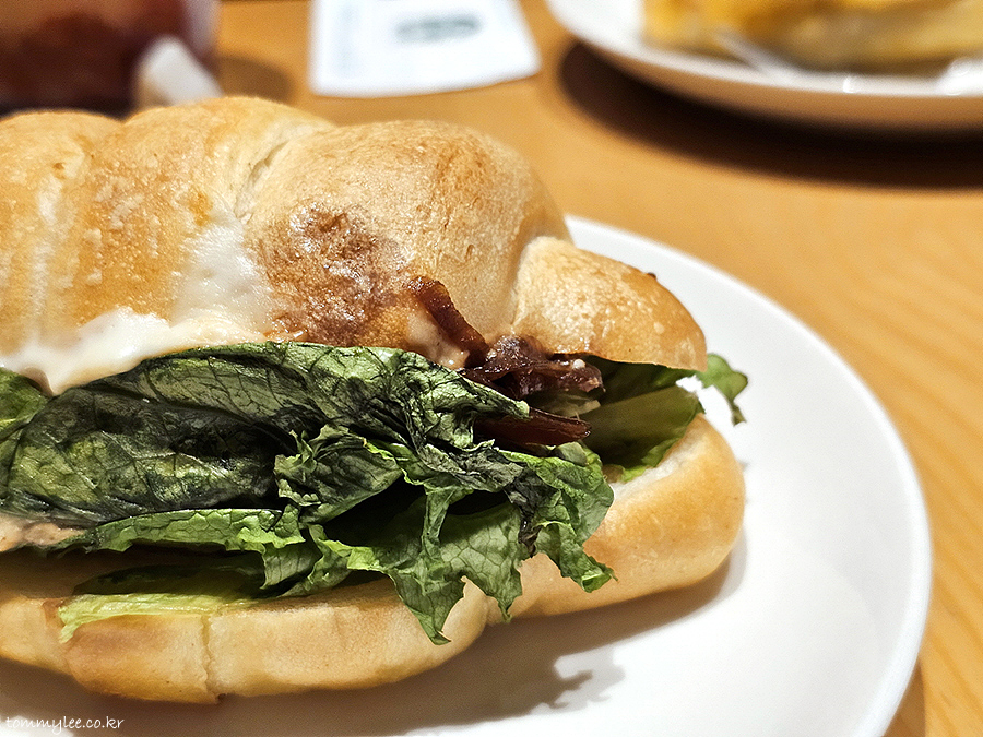 소금빵 밖으로 대거 탈출한 로메인과 리코타 치즈가 인상적이네요.. 속이 빵빵한 샌드위치인 점은 맘에 드는..