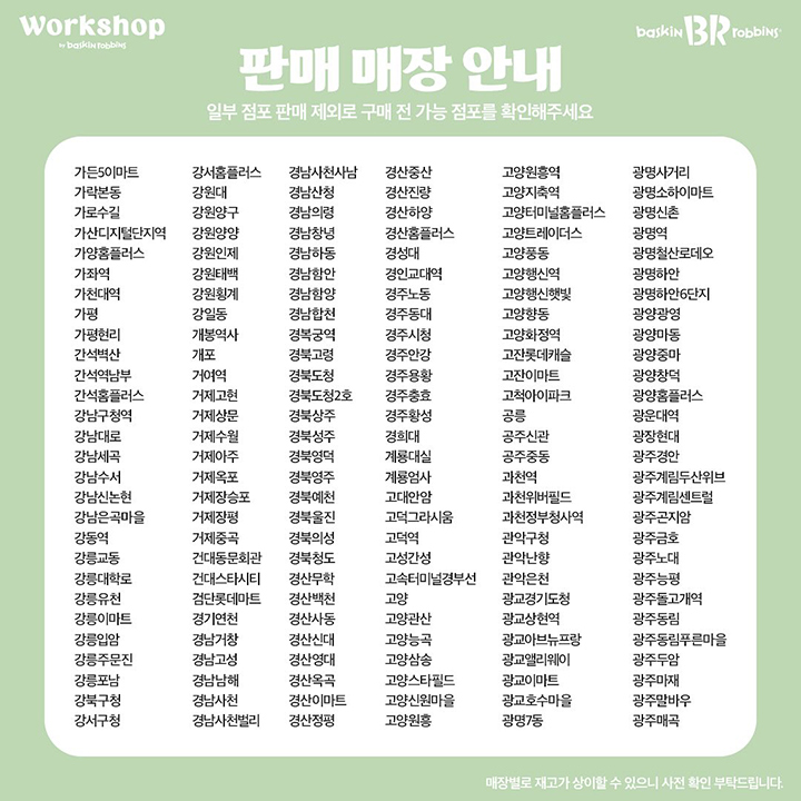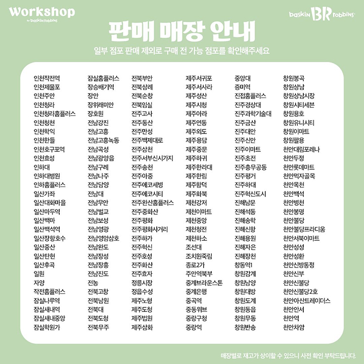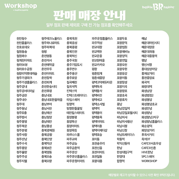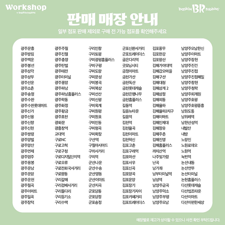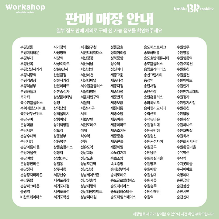 배스킨라빈스 와사비 아이스크림 판매매장 리스트입니다.. 이번 와사비 아이스크림은 화제성으로 출시한 이벤트 메뉴로 전 매장에서 판매하지 않고 일부 매장에서만 출시가 되었답니다.. 본사 차원에서의 강매는 없고 들여놓고 말고는 순수 점주 마음.. ㅡㅡㅋ..