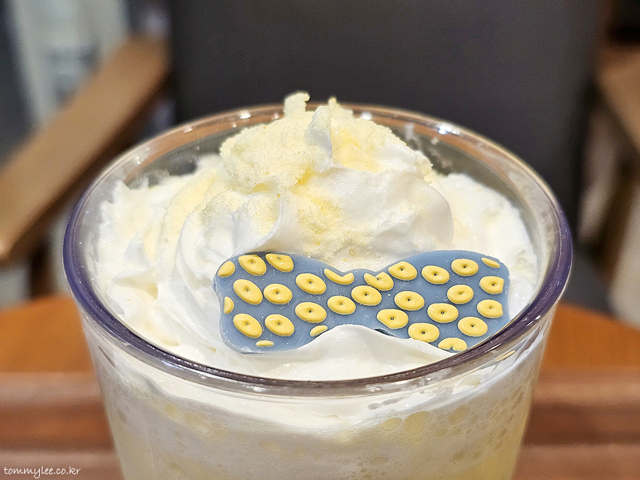 아이스 도쿄바나나 아이스크림과 우유, 바닐라크림, 얼음이 들어간 쉐이크 메뉴이고요.. 휘핑크림에 바나나 파우더, 도쿄바나나 시그니처인 블루리본 초콜릿이 올라가 있습니다.. 휘핑크림을 올리다 말아서 아쉽네요.. 더 예뻐야 마땅한데.. ㅠ.ㅠ..