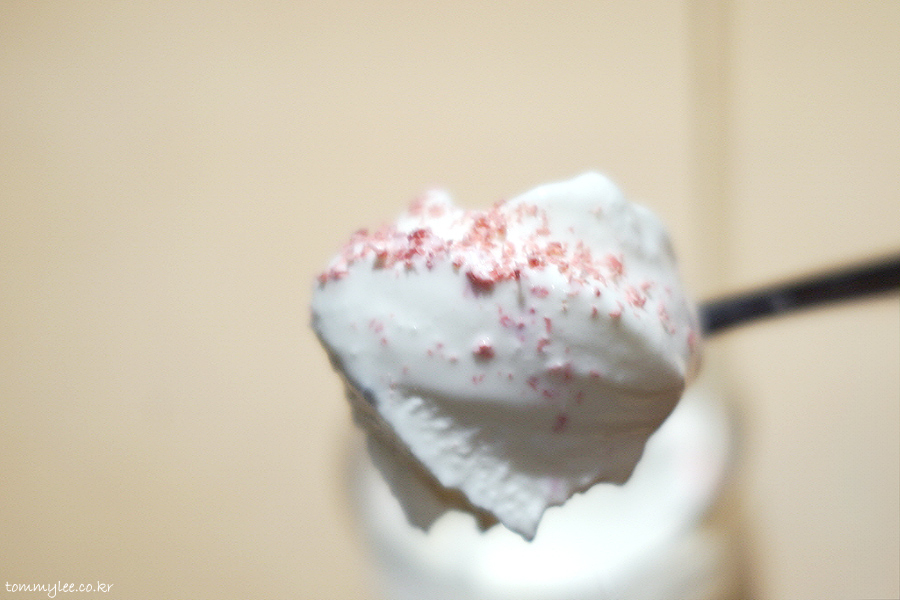 놀라 플로트에 스푼 주면 좋은데 여긴 신기하게도 안 줌.. 그래서 케이크에 주는 포크로 먹었어요.. 유기농 소프트 아이스크림을 퍼올리면 이런 느낌..