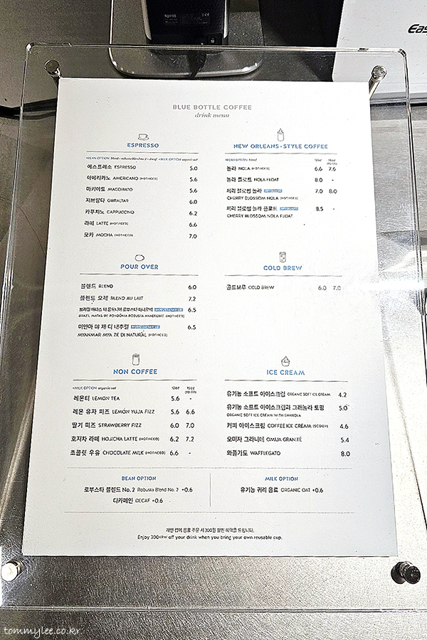 블루보틀커피 메뉴판.. 가격은 스타벅스와 그의 친구들보단 훨씬 높고 폴바셋, 커피빈보다 더 위라고 보시면 되는데.. 이게 또 그렇게 비싼 가격이진 않은 게 일본 블루보틀보단 약간 싸거든요.. ㅡㅡㅋ..