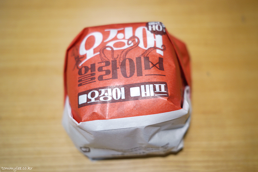 오징어패티 위에 오징어다리튀김을 올린 궁극의 오징어버거.. 오징어패티 대신에 비프패티를 선택할 수도 있는데.. 오징어패티가 빠지면 오징어버거가 아니게 됩니다.. 비프버전은 드실 필요가 없어요..