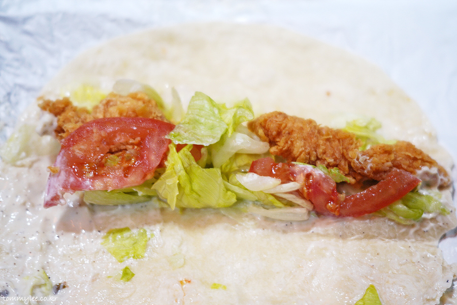 트위스터 내용물 확인을 위해 오픈해보면 이런 느낌입니다.. 밀또띠아 안에 치킨텐더 2조각, 양상추, 토마토에 마요네즈..