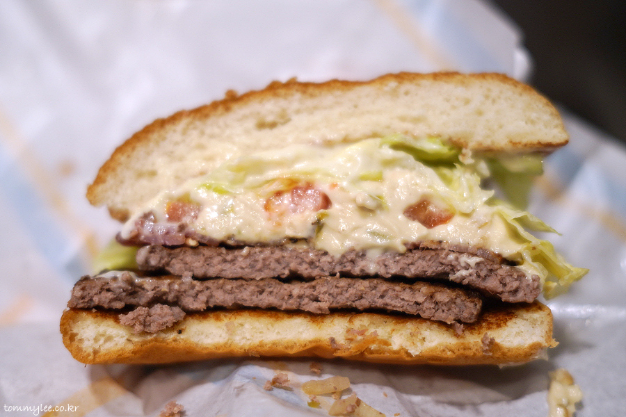 패티 2장에 베이컨 거기에 크림치즈까지 듬뿍 들어갔기 때문에 볼륨감이 꽤 있습니다.. 만족감에 비해 칼로리는 의외로 적은 편.. 597Kcal면 꽤 괜찮죠??..