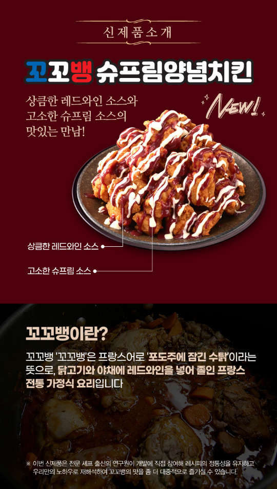 처갓집양념치킨 신제품 꼬꼬뱅 슈프림 양념치킨.. 상큼한 레드와인 소스와 고소한 슈프림 소스의 맛있는 만남을 표방했다고 합니다..