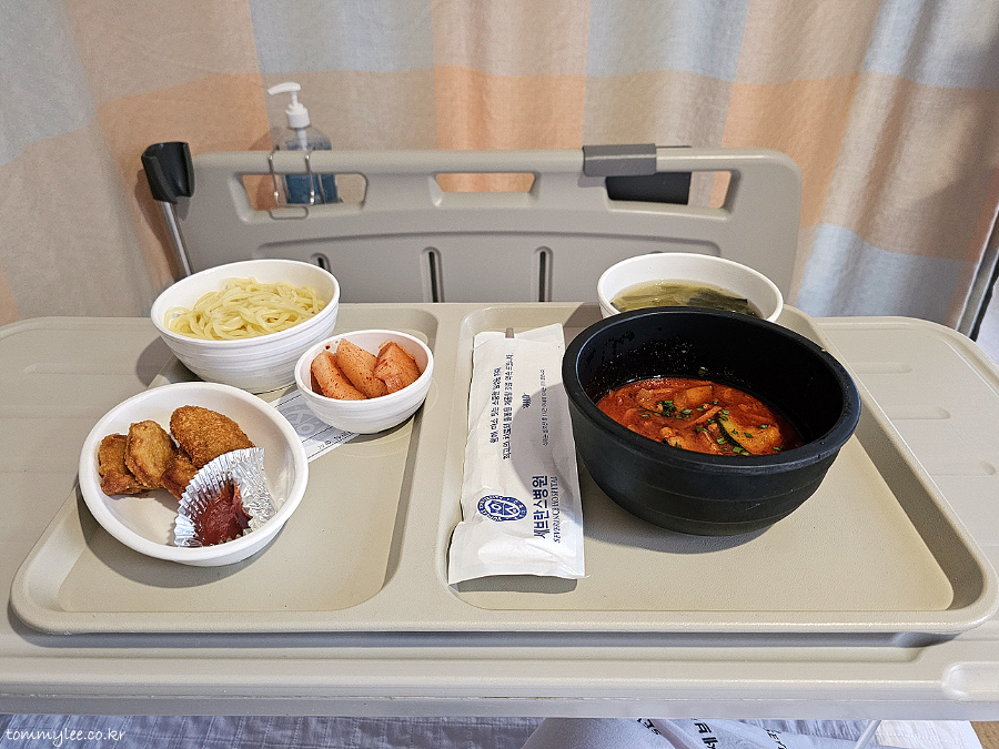 그나저나 테이블까지의 서빙은 배식 담당 직원분께서 도와주시지만 식기를 치우는 건 셀프.. 완전 환자의 몫이더군요.. 목발의 제가 이 트레이를 들고 수평을 유지하면서 병실 밖의 퇴식 카트까지 이동하는 것은 불가능해 반납 포기함.. 이래서 보호자가 필요하구나 싶었음.. ㅠ.ㅠ.. 결국 건너편 보호자분께서 치우는 거 도와주심.. ㅠ.ㅠ..