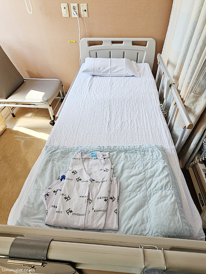 현재 의료대란이 진행 중이다 보니 병실 반은 비어 있는 상태였어요.. 수술 들어갈 사람이 없어서 수술날짜 잡기가 그리 힘들었던 것이었고, 5인실 또한 괜히 받은 게 아니었음.. 운이 좋았던 게 아니었어요.. 5인실이 텅텅 비어 있어서 그냥 받은 것 뿐.. ㅡㅡㅋ.. 환자를 돌볼 선생님이 없으니 환자를 받을 수가 없는 것이죠.. 5인실이지만 중간 베드 2개는 환자가 없어서 현실은 3인실이었답니다.. ㅎㅎㅎ.. 뉴스에 나오는 의료공백, 의료대란은 현실이었음.. 다른 대형병원도 세브란스와 비슷한 상황이라고 합니다.. ㅠ.ㅠ.. 암튼 입실 즉시 환자복으로 갈아입어야 한다는 담당간호사님의 말씀.. 이 기본 환자복은 속옷 입고 입는 거고.. 녹색 수술용 환자복은 맨몸으로 입으면 된다고 합니다.. 침구류는 3일에 1회 교체가 원칙이라고 하는데.. 요청하면 바로 갈아 주신다고 함..