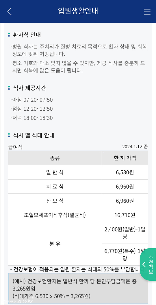 세브란스병원 환자식 가격은.. 일반식 6,530원, 치료식 6,960원, 산모식 6,960원, 멸균식 16,710원, 분유 2,400원, 특수분유 6,770원으로 최근의 미친 식물가대비 저렴한 수준.. 건강보험 적용하면 반값이 되니까 안 먹으면 막대한 손해이고요..