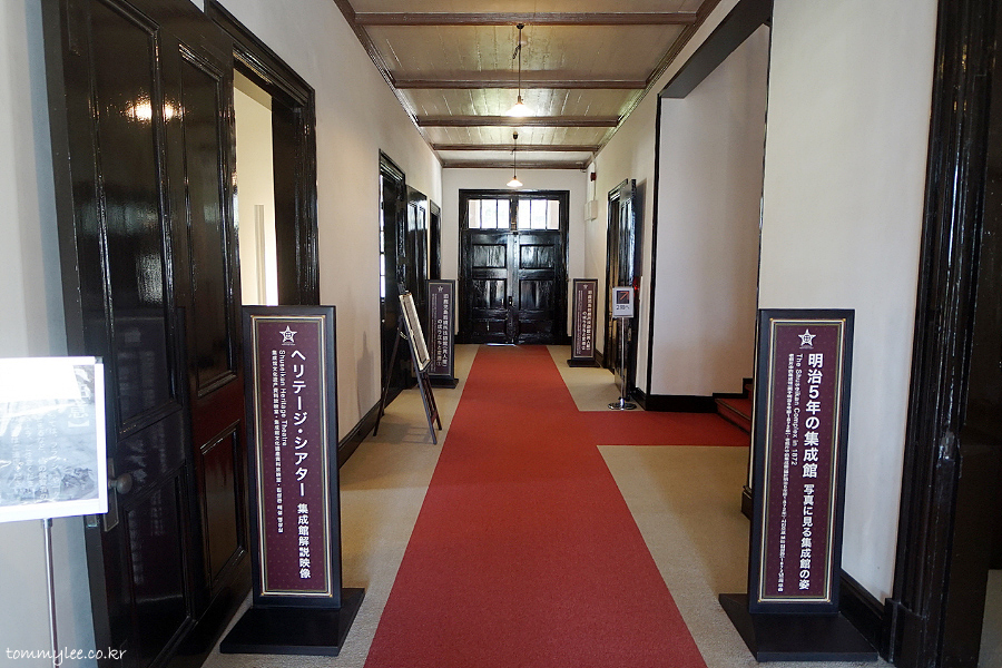 왼쪽 방이 메이지 5년 1872년의 슈세이칸.. 오른쪽이 헤리티지 시어터로 슈세이칸 해설영상이 나온다고 쓰여있는 모습..