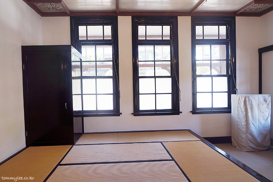 이 방을 보면서 특이했던 게 창쪽에는 이렇게 타다미가 깔려 있었어요.. 외관상으론 완전 서양식 건물이지만 일본스런 양식도 함께 공존했다는 거..