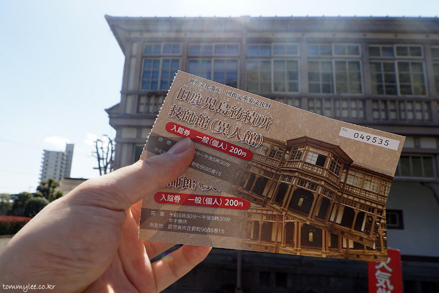 구.카고시마방적소기사관 입장권 을 들고 이진칸 앞에서 기념촬영.. 큐트패스 할인시설이라 20%할인을 받았답니다.. 입장료가 200엔인데 160엔(1,760원)으로 할인받았어요..