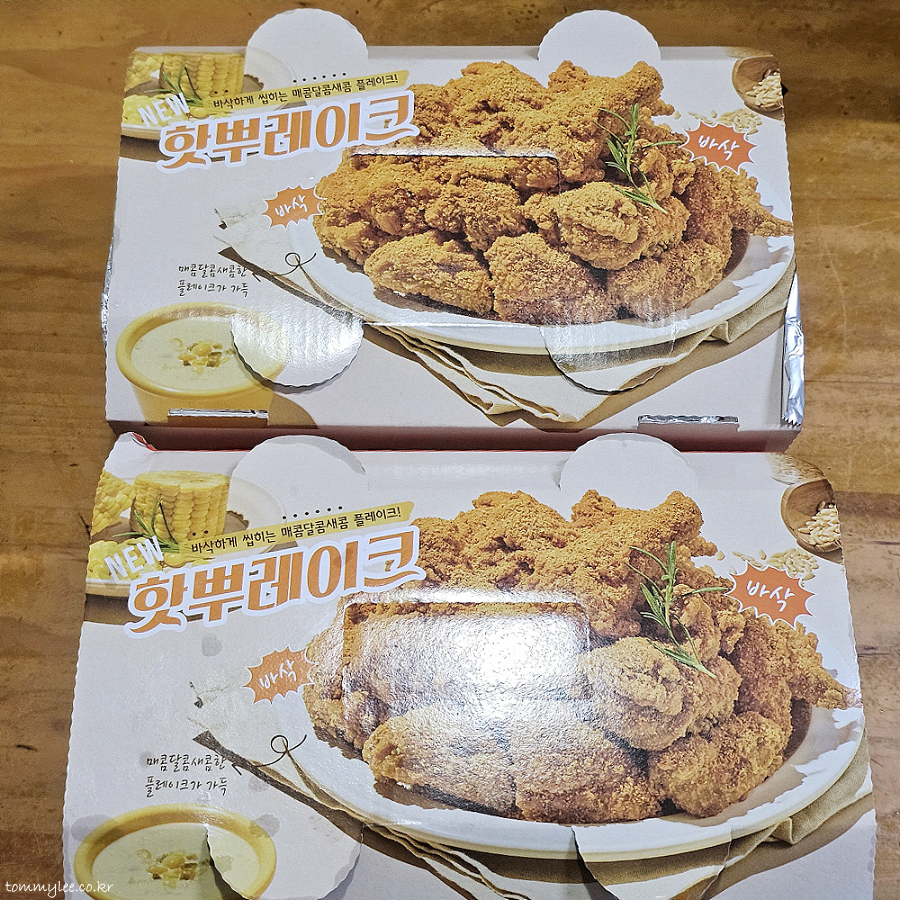 또래오래 치킨박스.. 바삭하게 씹히는 매콤 달콤 새콤 플레이크 핫뿌레이크.. 매울까 봐 주문을 못하고 있는 핫뿌레이크 치킨이 박스에 나와있습니다.. 먹음직스럽게 생기긴 했는데 매울까 봐 무서움.. ㅋㅋㅋ..