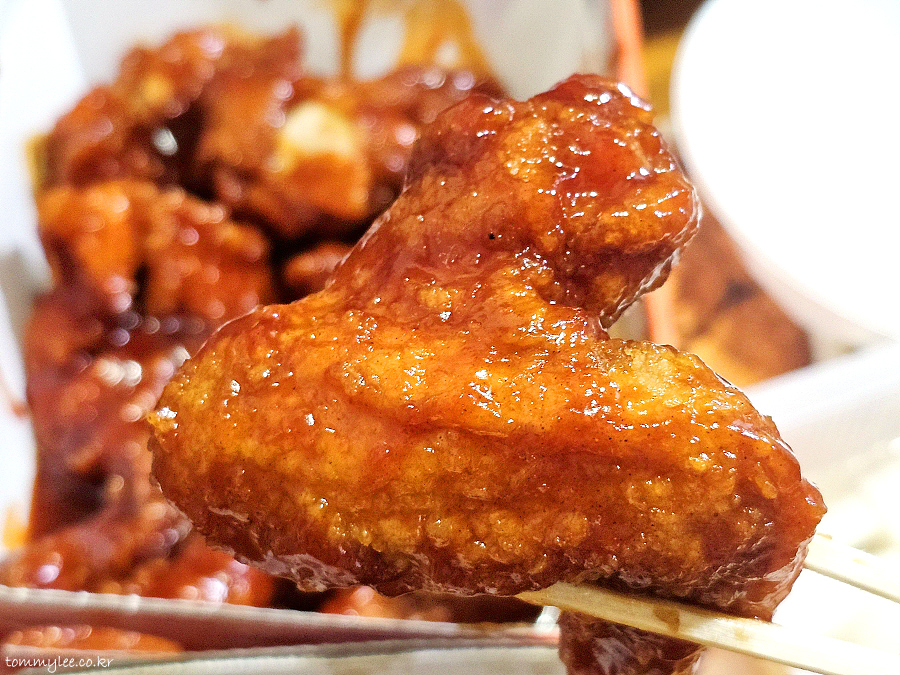 글로시하게 양념이 충분히 버무려져 있는 양념치킨의 모습..
