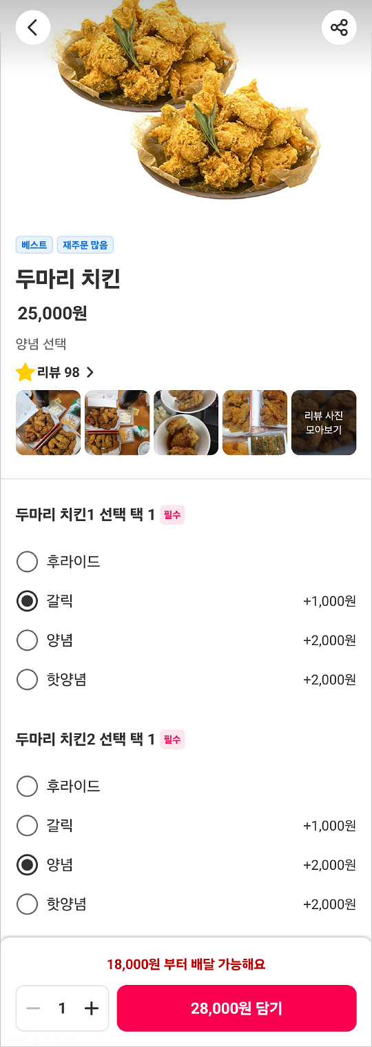 또래오래 두마리치킨 가격은 25,000원이고요.. 치킨은 후라이드, 갈릭, 양념, 핫양념 4가지 중에서 선택할 수 있습니다.. 또래오래의 추천 조합은 갈릭+핫양념인데요.. 저는 매운 거 못 먹는지라 핫양념은 무리라서 양념으로 주문.. 추가금은 갈릭 +1,000원, 양념 +2,000원입니다.. 요기요 치킨 초특가 할인행사로 6천원 할인받아 26,000원에 두마리 주문..