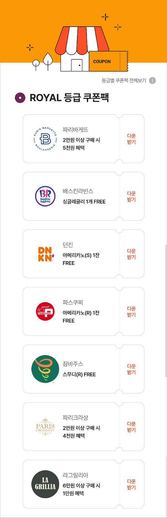 해피포인트 멤버십 로얄 등급 쿠폰팩 내용은.. 파리바게뜨 2만원 이상 5천원 할인, 배스킨라빈스 싱글레귤러 무료, 던킨 아메리카노 무료, 파스쿠찌 아메리카노 무료, 잠바주스 스무디 무료, 파리크라상 2만원 이상 4천원 할인, 라그릴리아 6만원 이상 1만원 할인..