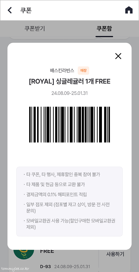 해피포인트 멤버십 최고 등급이 로얄이지만 딱히 별건 없습니다.. 배스킨라빈스에선 싱글킹이라도 줘야 하는 거 아닌가 싶은데.. ㅡㅡㅋ.. 암튼 싱글레귤러 무료 쿠폰 사용하러 가까운 배라 매장을 찾았네요..