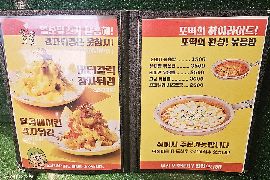 감자튀김 : 버터갈릭 감자튀김 6,500원, 달콤베이컨 감자튀김 6,500원 / 볶음밥 : 소세지볶음밥 3,500원, 날치알볶음밥 3,500원, 베이컨볶음밥 3,500원, 그냥볶음밥 3,000원, 모짜렐라치즈토핑 2,500원..
