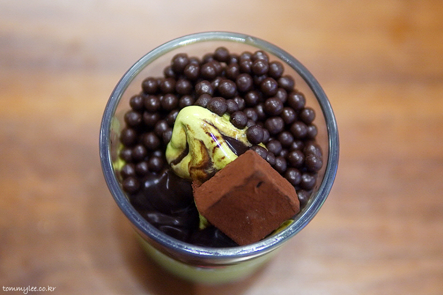 제주 말차 아이스크림에 초코퍼지 소스, 초코볼과 파베초콜릿이 토핑 되어 있답니다.. 홈페이지 메뉴 설명엔 브라우니가 토핑 된다고 잘못 나와있지만 고급진 파베초콜릿이 토핑 됩니다.. 일반적인 생초콜릿으로 보시면 되겠고요..