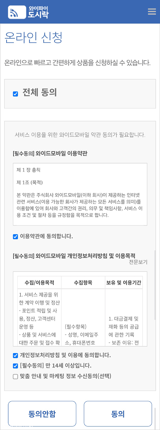 와이드모바일 이용약관 전체 동의를 체크한 후 동의 버튼을 누릅니다..